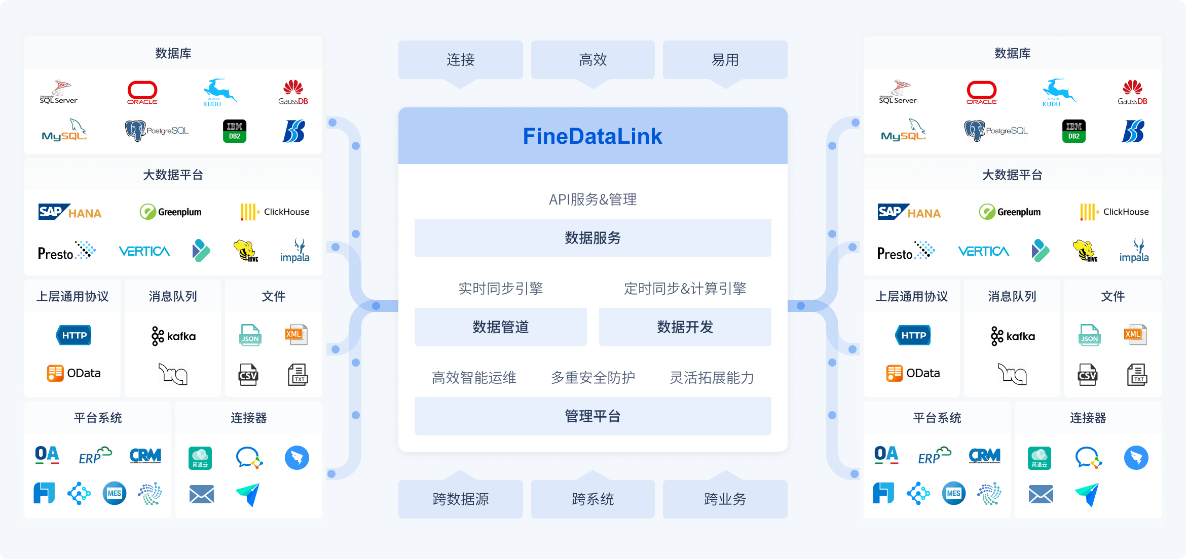 快速集成各大关系型数据库、大数据类、国产数据库类、NoSQL、接口、文件等7大类数据源